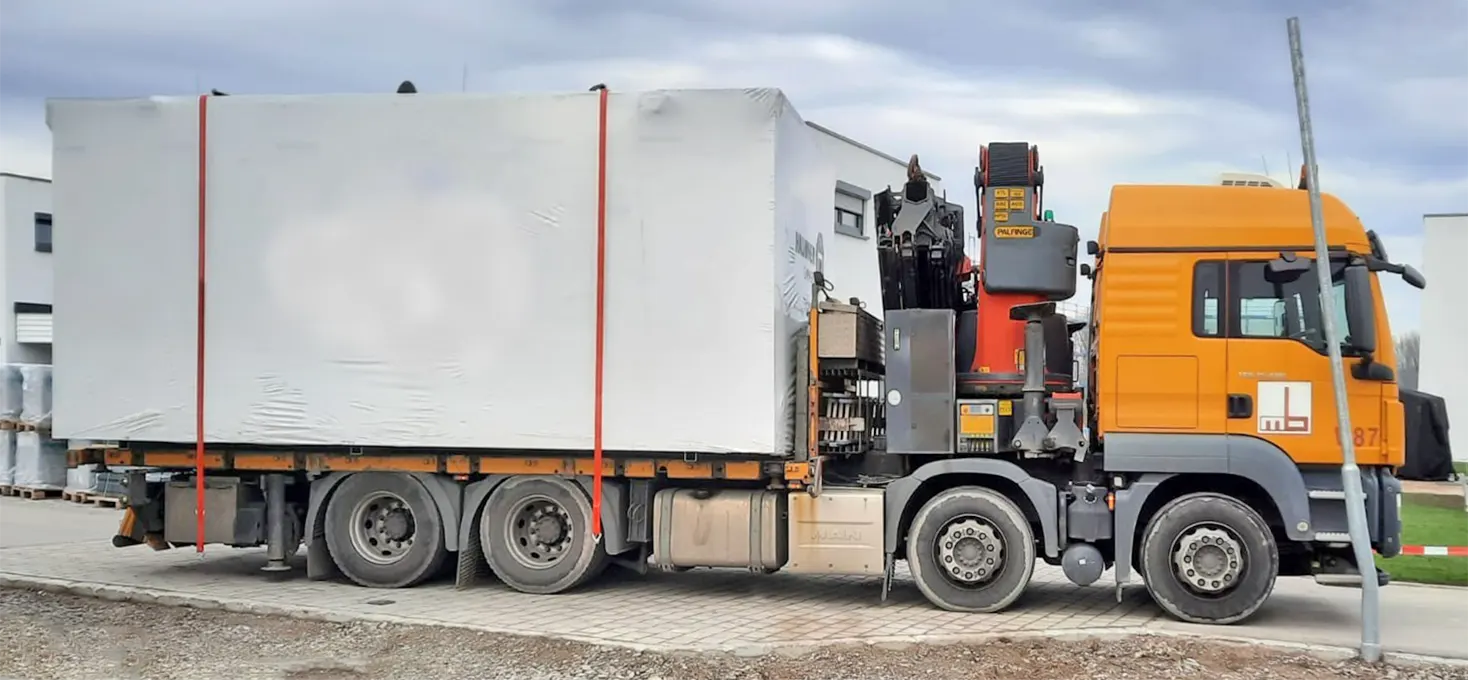 Mittels eines Ladekrans, der auf unserem LKW montiert ist, wird Ihre Knopp Garage nach vorheriger Terminabsprache geliefert und auf die vorbereiteten Fundamente angesetzt sowie fachmännisch verschraubt. Bei größeren Anlagen ist ein mobiler Autokran oder Baukran erforderlich.